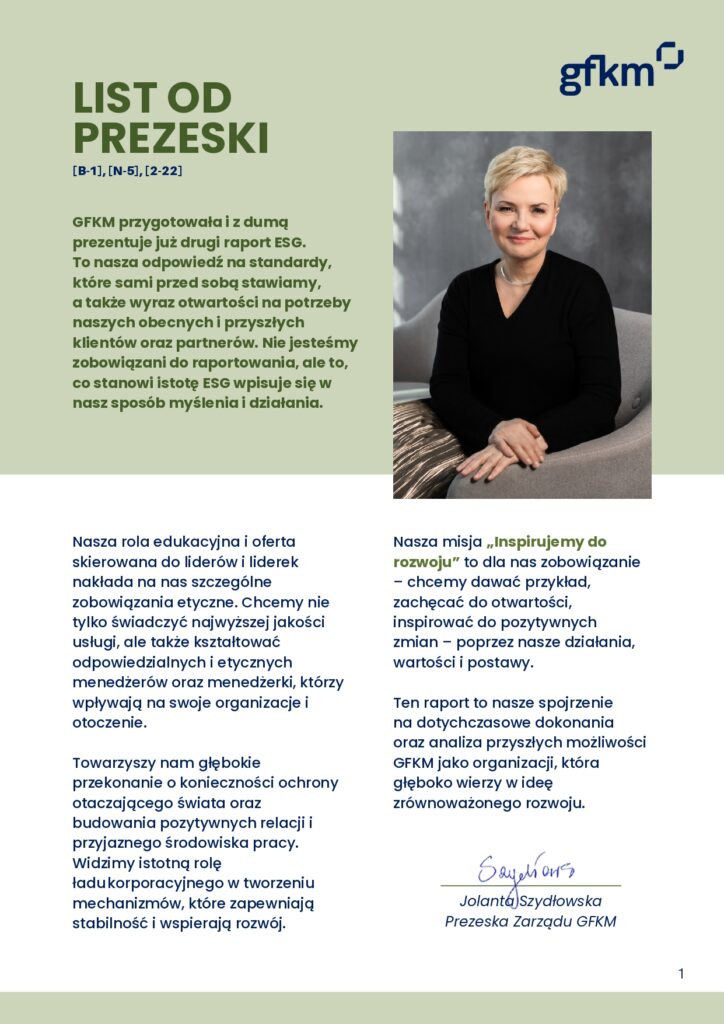 Raport został opracowany przez Zespół ds. Zrównoważonego Rozwoju i ESG, który koordynuje prace w tym obszarze działalności GFKM. W raporcie między innymi: